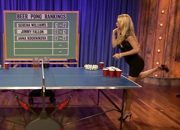 Anna Kournikova was on ‘Jimmy Fallon Live’ playing a round of Beer Pong, it’s a game where you have to shoot the ping pong ball into a cup and whoever gets it in first wins and the loser has to drink. I have no clue who won because I was staring at Anna’s legs in those high heels and tight sexy dress…