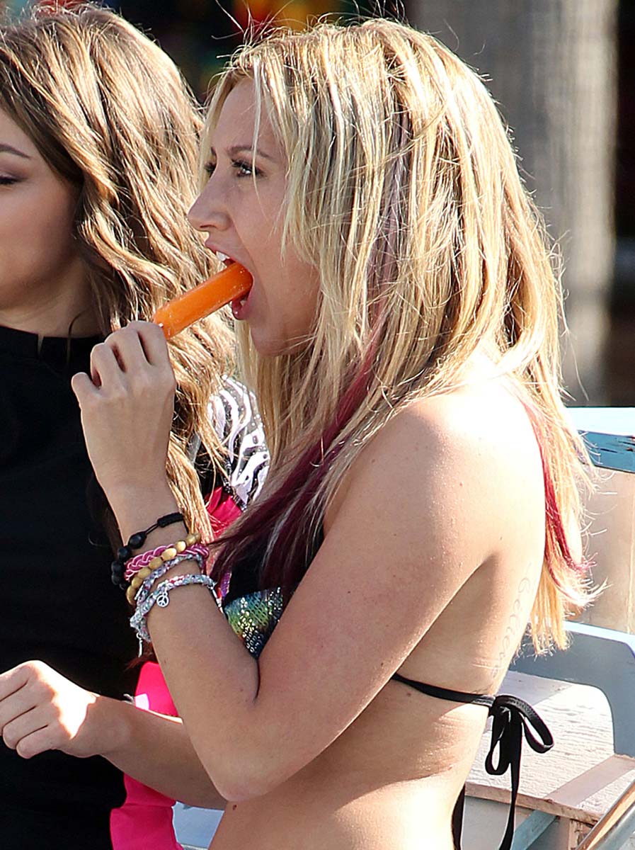 I know I’ve said many times before that this Ashley Tisdale hot babe is one of those useless chicks whi not having any work but going to the gym, but everytime I see her in a bikini or sexy little outfits I eat my words and stay speechless. Here she is in her awesome little bikini androller skate costume showing off all her hard work during some photoshoot. Well done Ashley. She must spend a lot of time doing deep knee bends because that little booty is just spectacular. Enjoy.