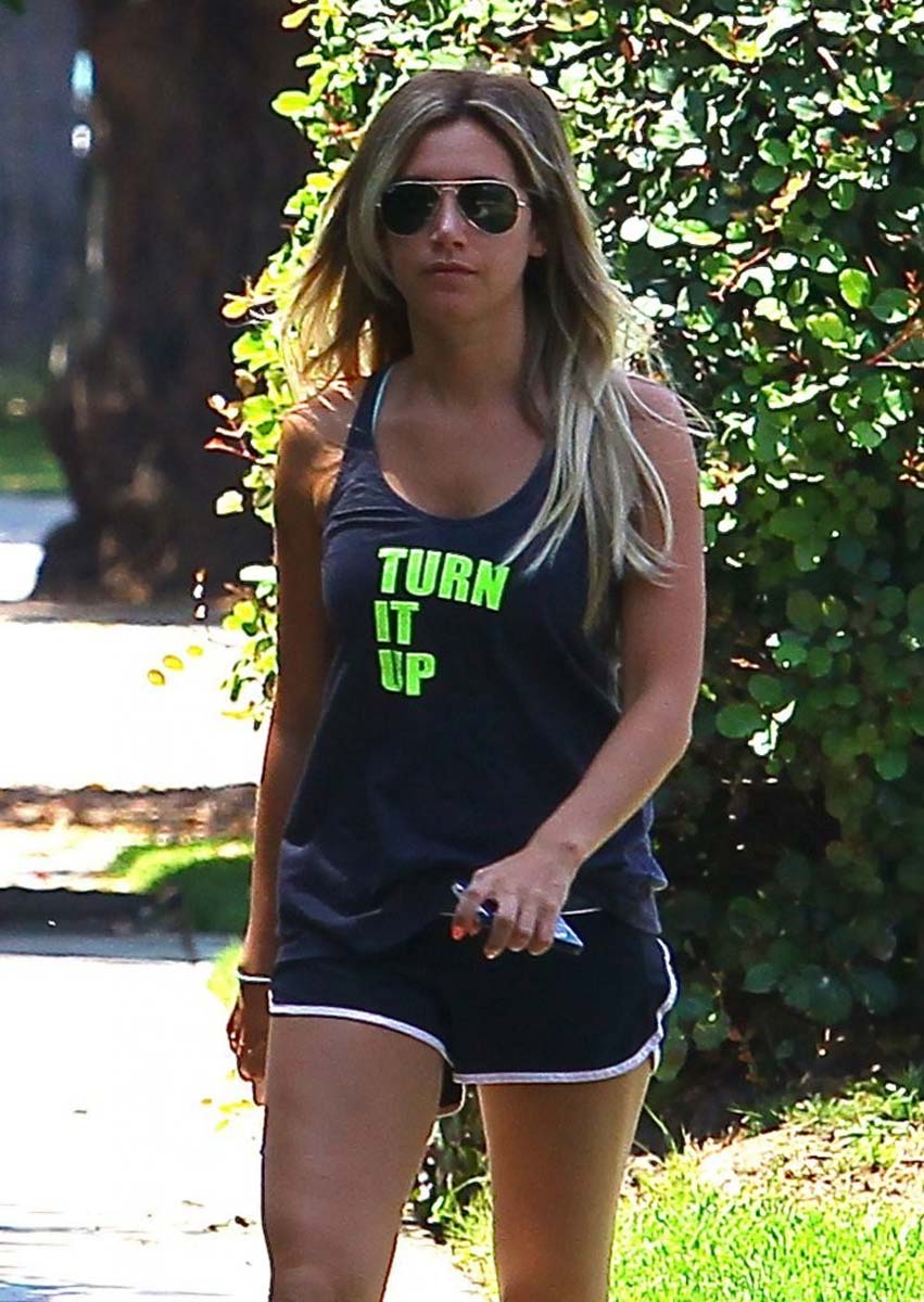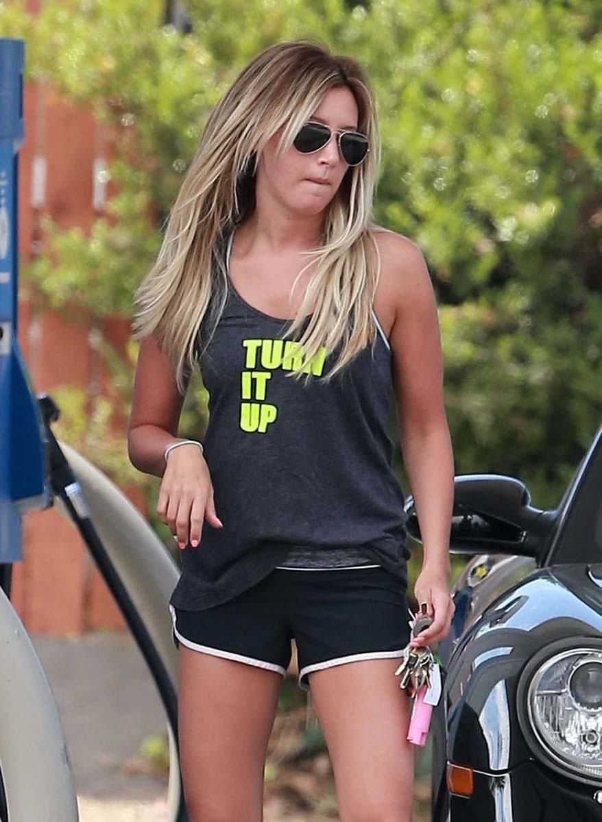 When I first heard there were pictures of Ashley Tisdale pumping in short shorts, I got pretty excited that we’d be seeing shots of her at the gym doing squats or deep knee bends or some equally sexy exercise. Instead though, we got these pictures of her at the gas station. Don’t get me wrong, they’re still pretty hot. But I was hoping to see that booty of Ashley’s in some kind of sweaty action, not patiently waiting for a receipt.