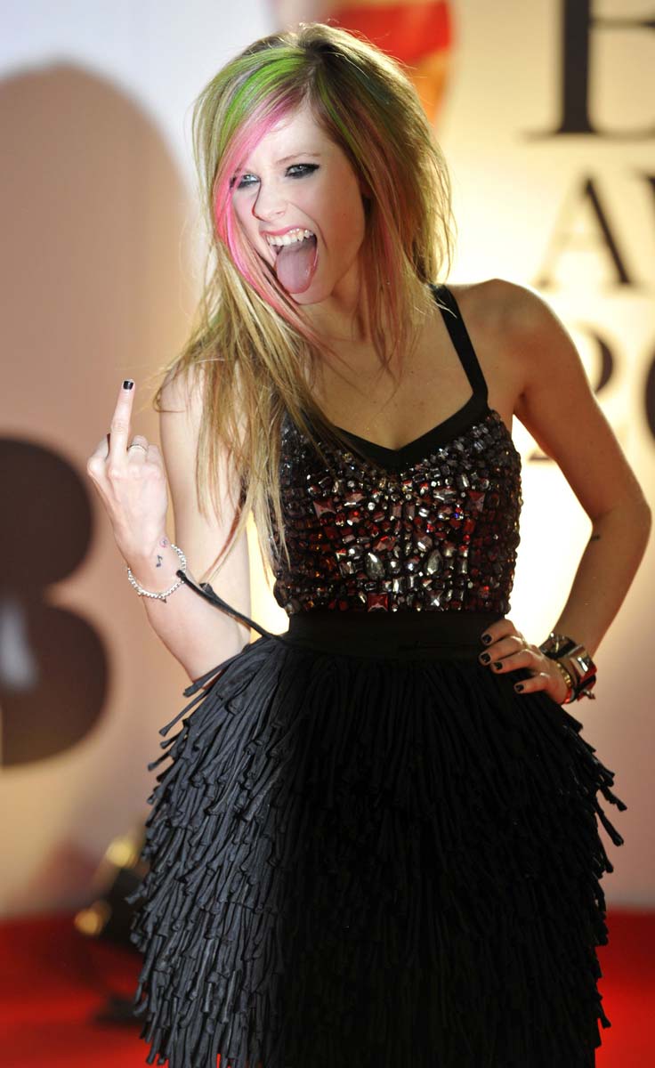 Since I put Avril Lavigne hot lingerie pictures from her music video “What the Hell” and saw how awesome body she has, Avril became my favorite nasty little girl. Here she is at British Awards last night looking all dirty and hot in her short black dress, while she giving us a finger. Of course I hate her stupid colorful-highlighted blonde hair, but still like her nasty punk rock stile.