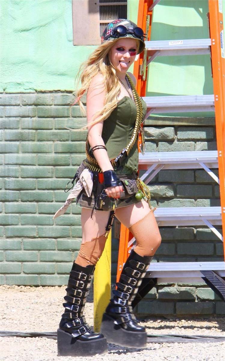 I’m not the biggest fan of Avril Lavigne hot babe these days, mostly because she is married to that douche from Nickelback. But she must be trying to win me back, because I’m digging the sexy army costume. Here she is shooting her new music video “Rock N Roll” and giving the camera some sweet tongue and leg action. Now if we can just get her to divorce court, we’ll really be back in business again. Hot!