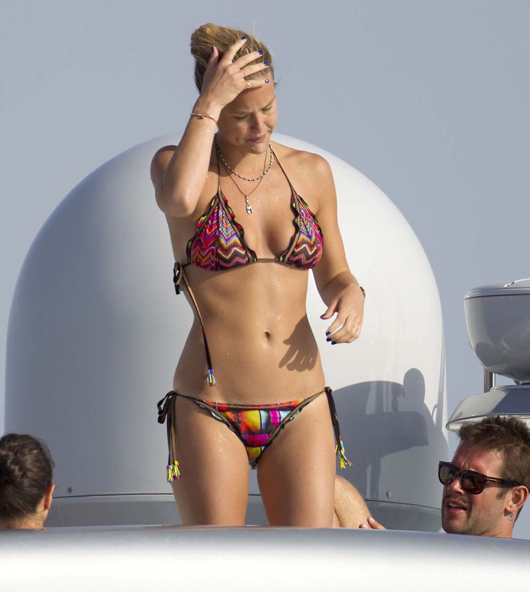 Oh ya, it’s supermodel bikini time. Here is supermodel Bar Refaeli on vacation in Spain, on a yacht, in a very small bikini. You’re welcome. Supermodels on vacation should be a reality TV show. They don’t even have to speak, just walk around in their bathing suits, sunning themselves on some rich old dude’s yacht. You know you’d watch it. Enjoy these Bar Refaeli bikini photos.