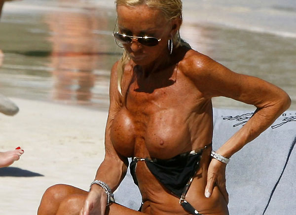 I was ashamed that I generally put on this site,but there is Donatella Versace topless bikini in St. Barts.I don’t know how I could look at all these pictures with burned frog by sunbathing her failed old bags of silicon.I think I’m sick and very sorry that you did not spare the horror.Trying desperately to get this images out of my head,but my eyes are still burning!!!