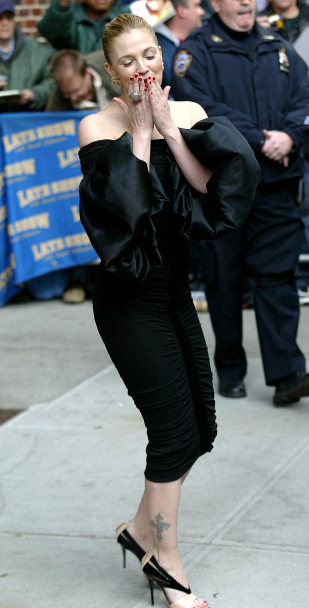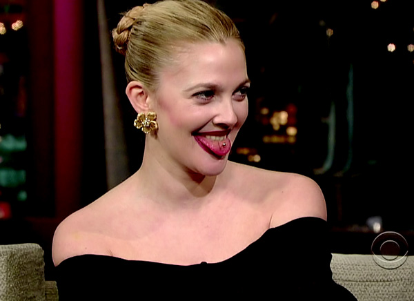 Drew Barrymore was on Letterman showing us why she’s one of the most annoying celebrities in Hollywood. She shows her tongue piercing… She’s supposed to be promoting her new movie ‘Grey Gardens’ about a couple of old lady lesbian’s leg wrestling together for 50 years….