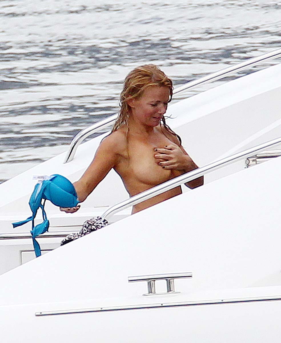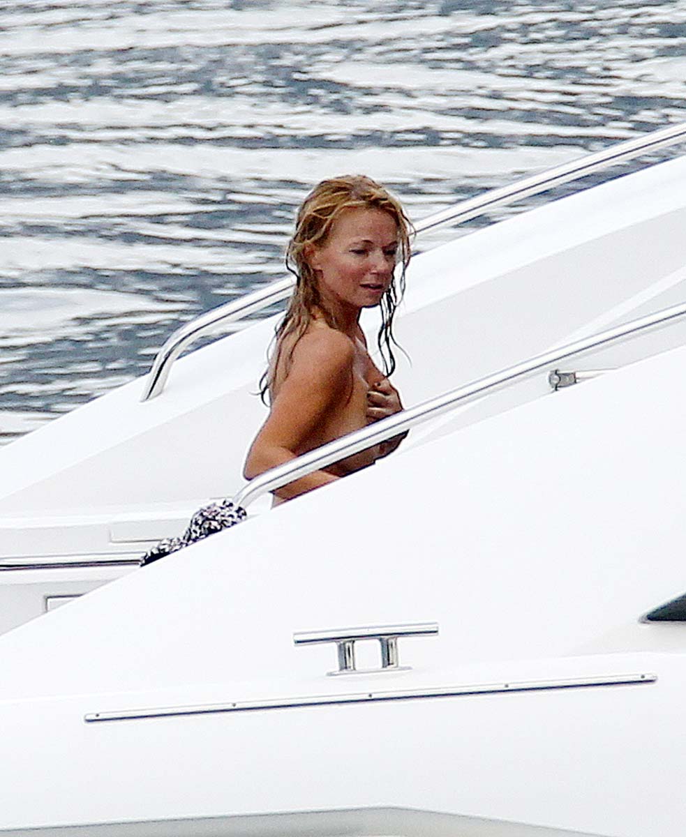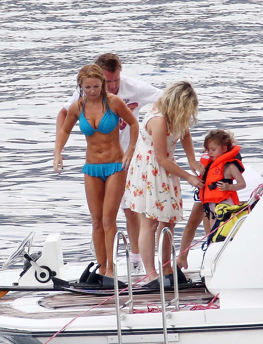 I’ve had a long day of blogging, mostly because I haven’t been this hungover in a long time, so I thought a good way to finish off the week would be with some shots of Spice Lady Geri Halliwell hanging out in a bikini and gets topless during her vacation in France. Unfortunately we don’t have a decent look at Geri Halliwell topless because she’s fondling her big breasts like a champ so I thought I should throw her in for you guys. Did she get new breasts or something? She can’t seem to keep her hands off those things. Not that I blame her, I’d be all overmyself if I had those things…. I gotta say that I’m constantly amazed at how good Geri Halliwell looks for a woman her age. Oh, how I wish I was a rich old dude with my own yacht so I could take a stab at her. Amazing.