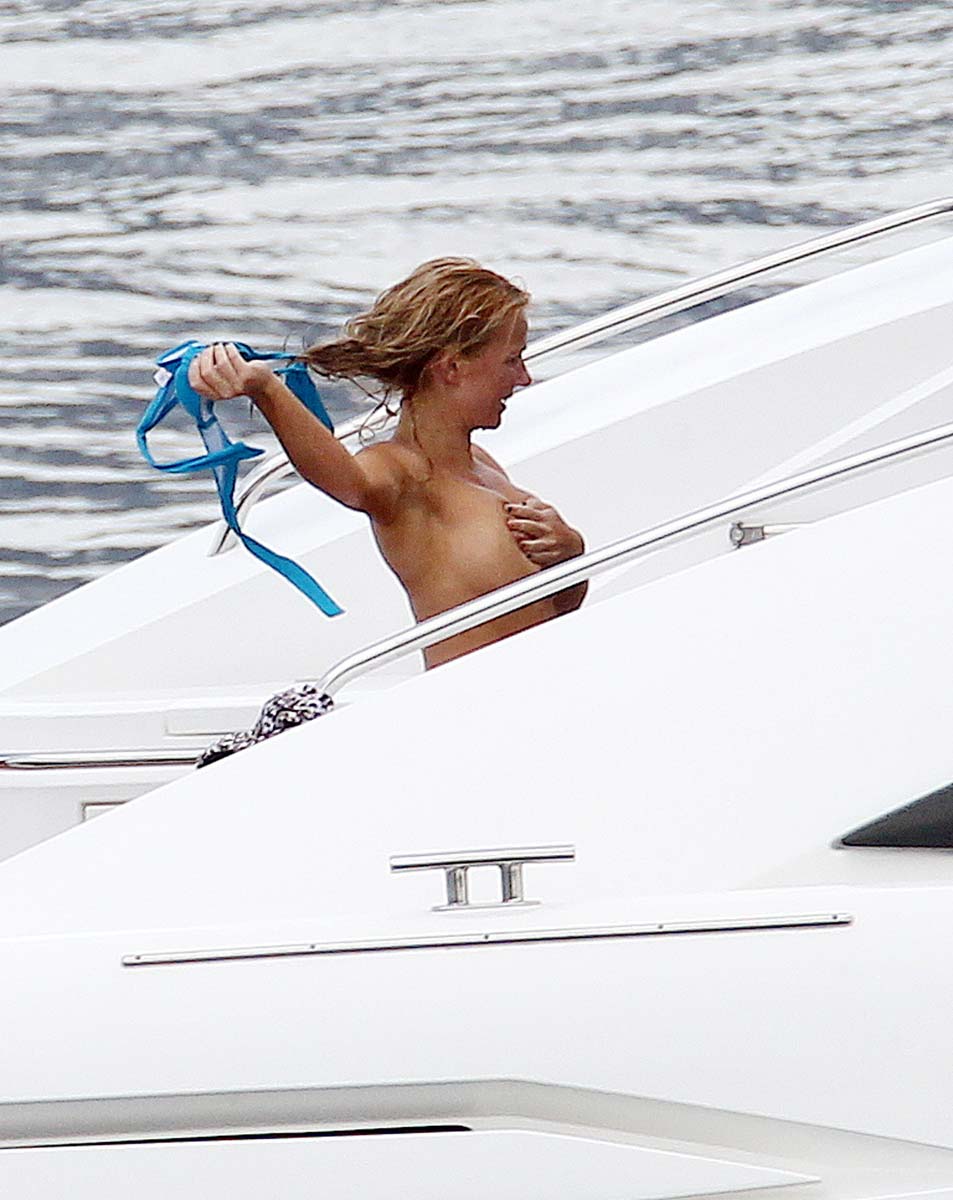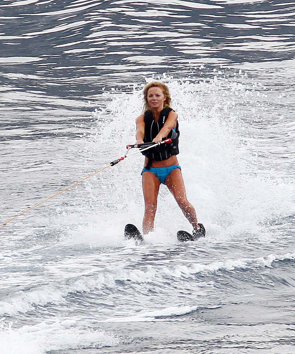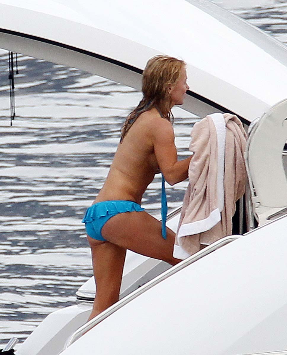 I’ve had a long day of blogging, mostly because I haven’t been this hungover in a long time, so I thought a good way to finish off the week would be with some shots of Spice Lady Geri Halliwell hanging out in a bikini and gets topless during her vacation in France. Unfortunately we don’t have a decent look at Geri Halliwell topless because she’s fondling her big breasts like a champ so I thought I should throw her in for you guys. Did she get new breasts or something? She can’t seem to keep her hands off those things. Not that I blame her, I’d be all overmyself if I had those things…. I gotta say that I’m constantly amazed at how good Geri Halliwell looks for a woman her age. Oh, how I wish I was a rich old dude with my own yacht so I could take a stab at her. Amazing.
