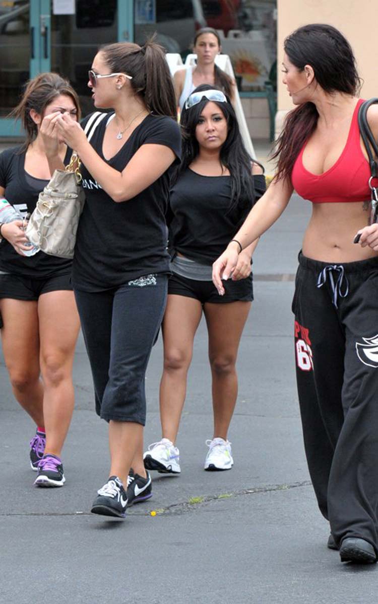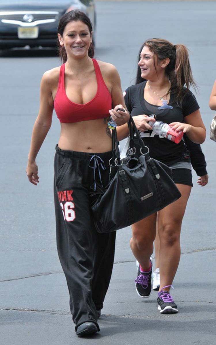 You know that I’m still not close with this Jenni JWoww Farley chick… Now let me just start off by saying that I wasn’t even remotely attracted to this girl up until a couple of months ago when she cleaned up her act and started looking more normal and less Jersey Shore… but, as you can see with this appearance, she’s back to looking Jersey Shore. And I’m totally talking about her face. But here she is giving me a nice look at those two things that I definitely like to see stuffed in some little sports bra. This has got to be one of the strongest sports bras I’ve ever seen, it has to be if it’s going to support JWoWW’s massive fake breasts while she pretends to go for a run. I would definitely like to see high definition slow motion video of this…