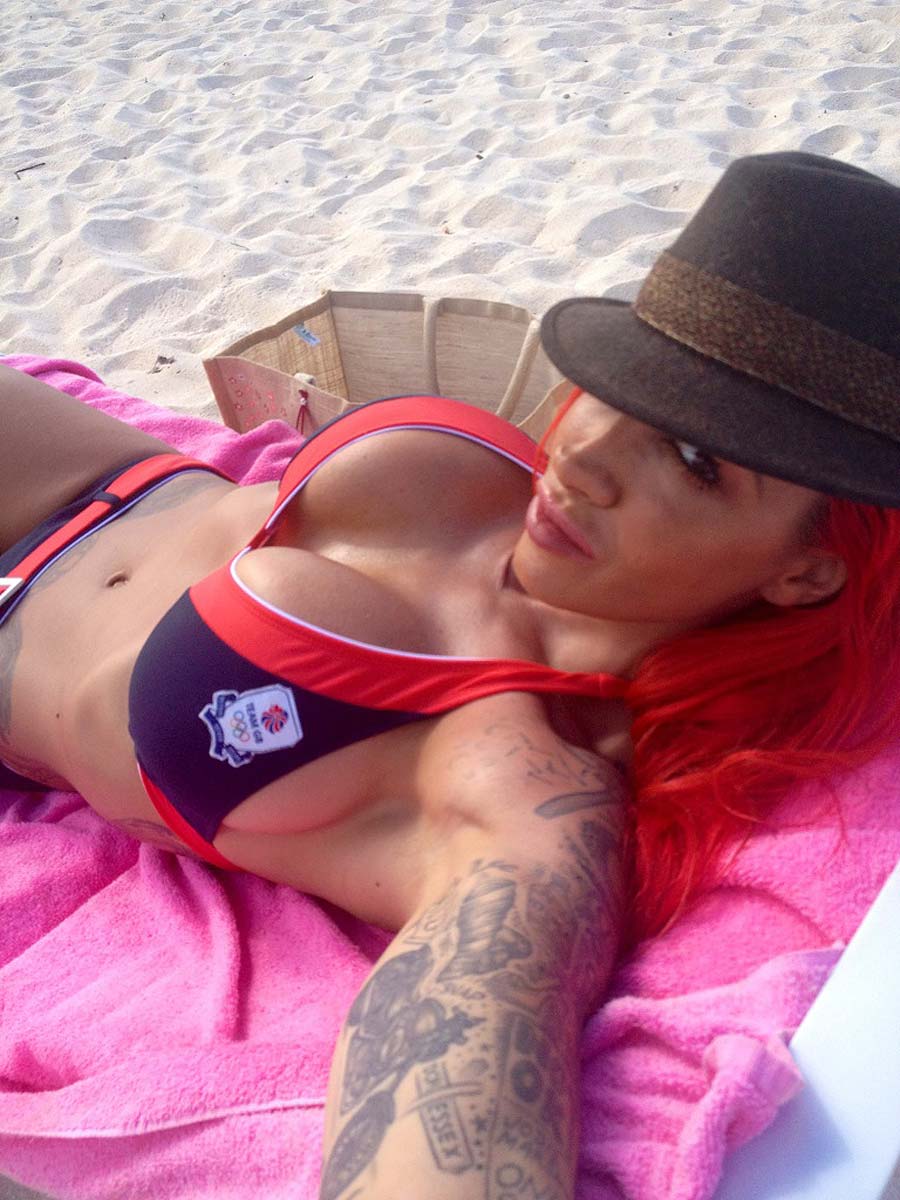 I’ve seen a lot of pretty awesome Twitter pictures over the last few years and I am quite surprised that Jodie Marsh had not twitted pictures of herself until now… But it’s never too late. Here she is showing her support for Great Britain by tweeting pictures of herself in a bikini. Now with the phat huge tits, the tattoos up the yin yang, the gaudy red hair and the way she wears that body in bikinis, I’m betting she hopes somebody notices her. What do you think?