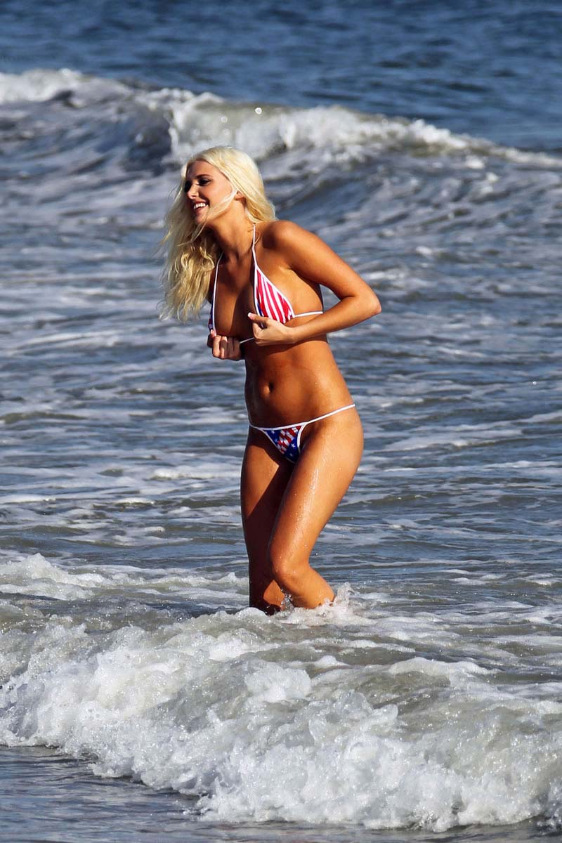 Here are some pictures of a hot piece of ass Karissa Shannon in her tiny all-American bikini. This is really nice way to celebrate the 4th of July.If you ask me nothing says America like a fake blond in a thong. I think that’s in the constitution.Enjoy