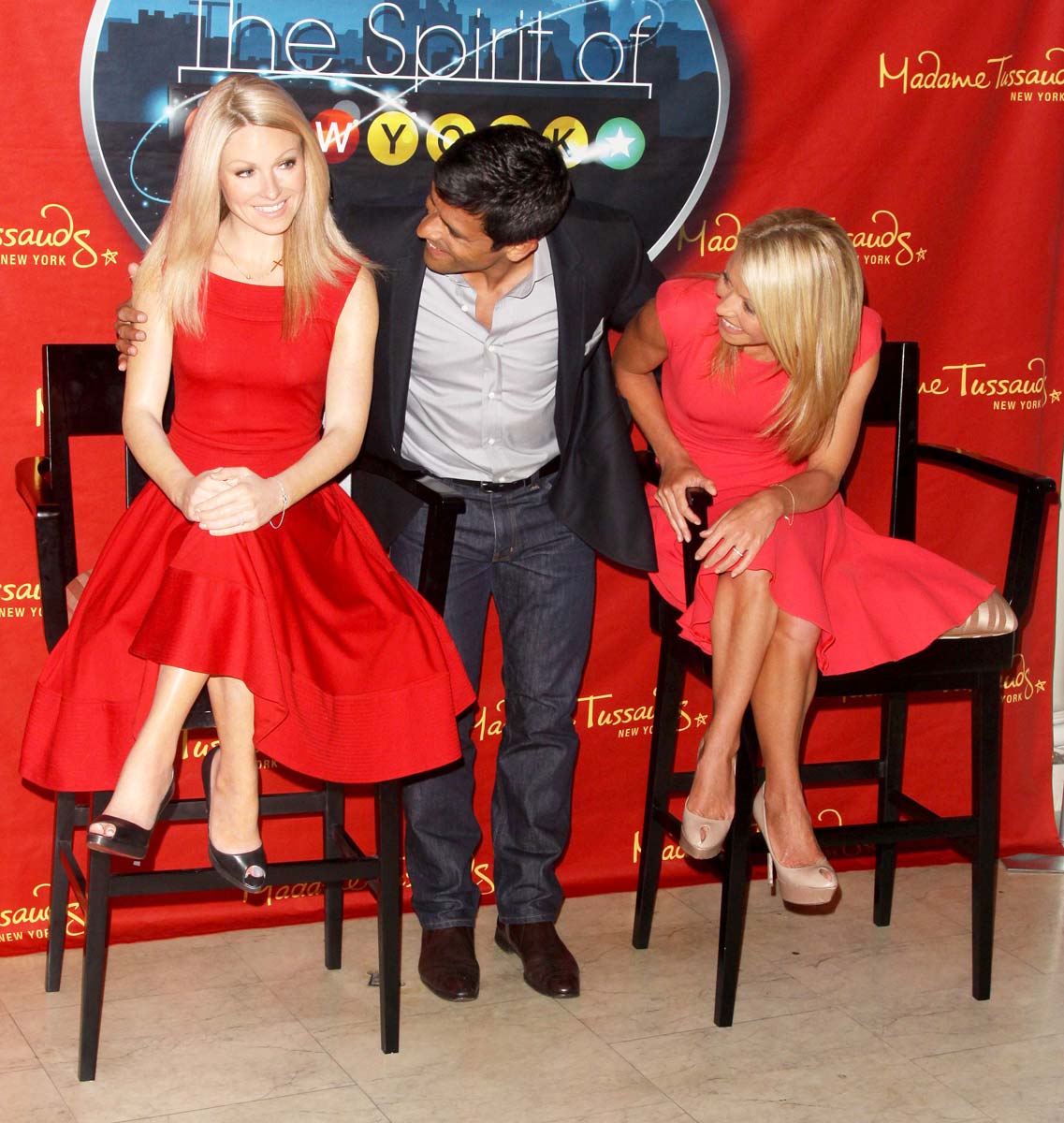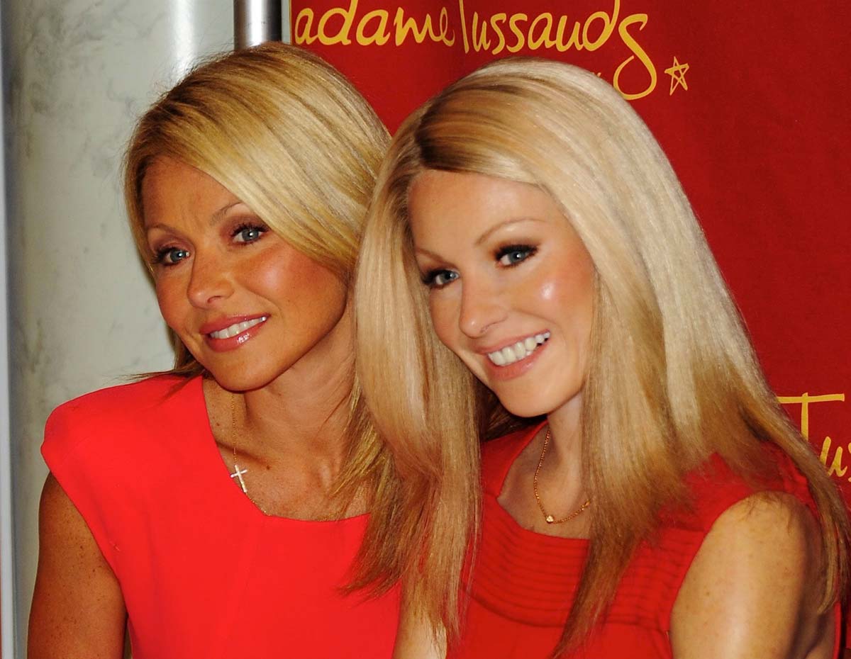 Here is Kelly Ripa poses with his twin made of wax at the Madam Tussauds Museum in New York the other day. I know that all of these egomaniac celebrities are so excited about having a wax replica of themselves, but I really don’t understand this garbage. I do not know why I continue to post all these pictures on the site… probably because this is another opportunity to see my girls all arranged while posing for the cameras, and Kelly Ripa got a chance to do it in this hot red dress, so I guess it’s OK that I liked this, especially because I see her in double issue.