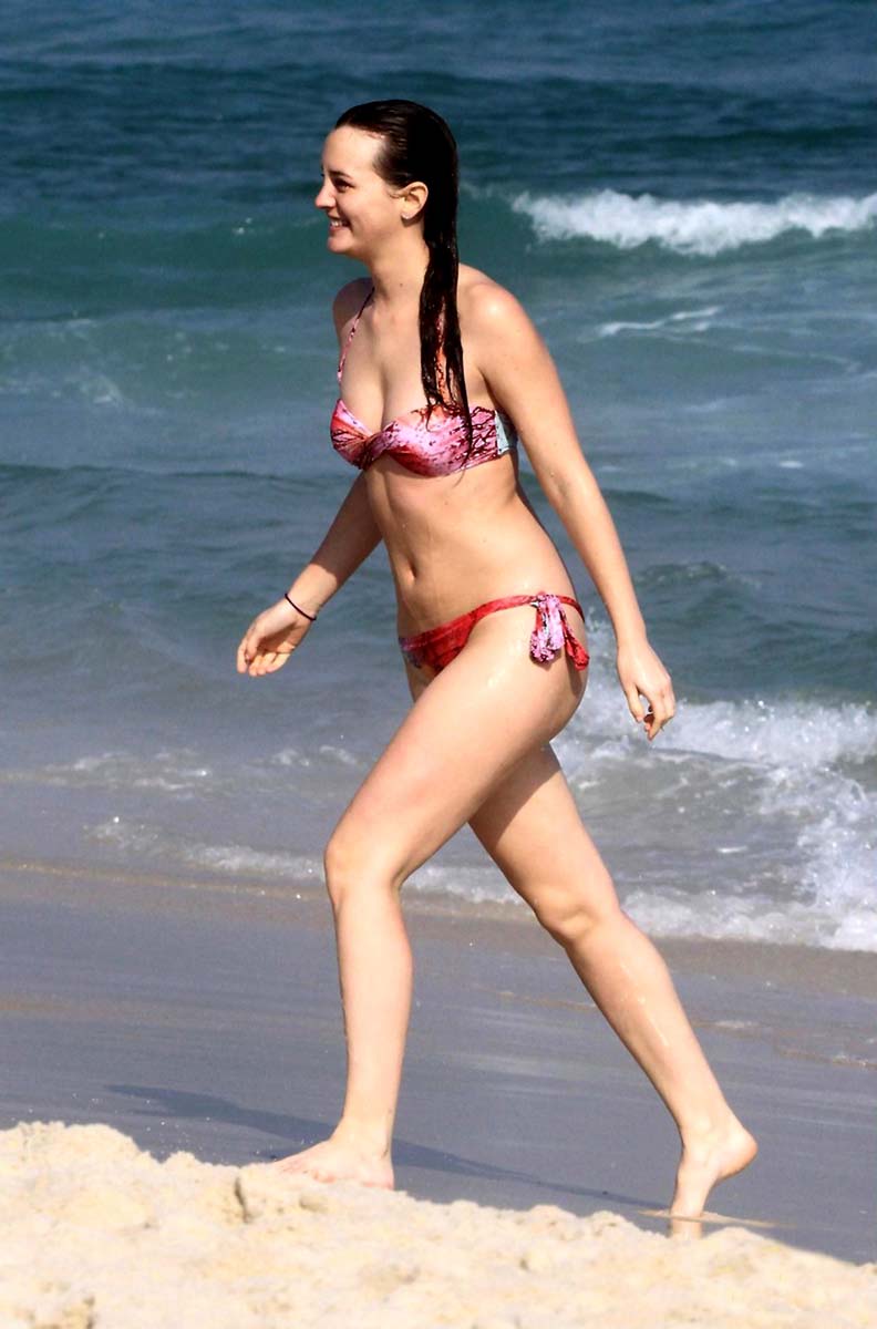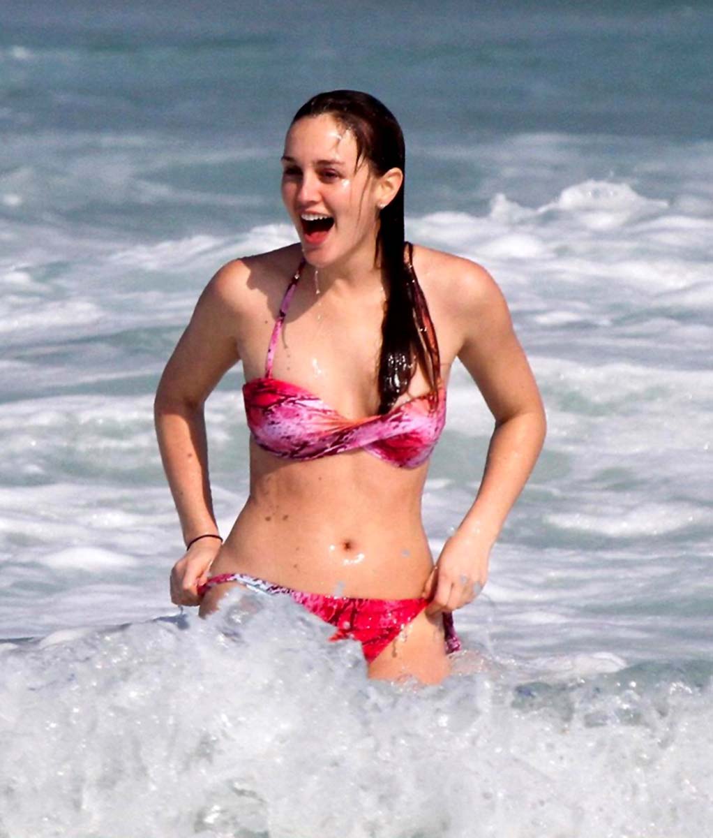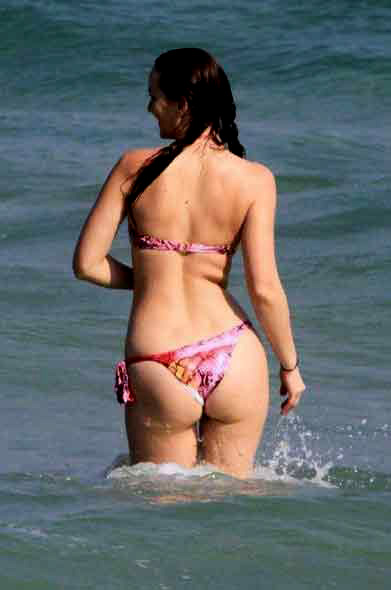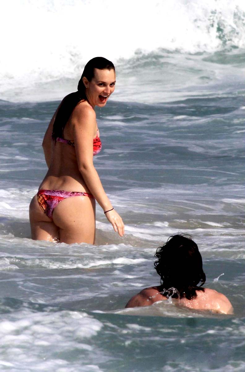 You would think that a half assed celebrity like Leighton Meester would be able to go to the beach in Brazil with her caveman boyfriend without having her picture taken, what are the odds some Brazilian is going to recognize a chick from Gossip Girl? Come on. Anyhow, here she is with her surprisingly large booty stuffed into a nice littlebikini. I guess when you’re in Rio you do what the Brazilians do. Now oil that thing up and lets see what it can do. Clearly I get a lot of my cultural information from the internet.