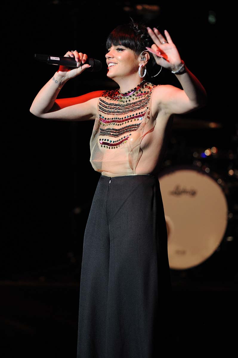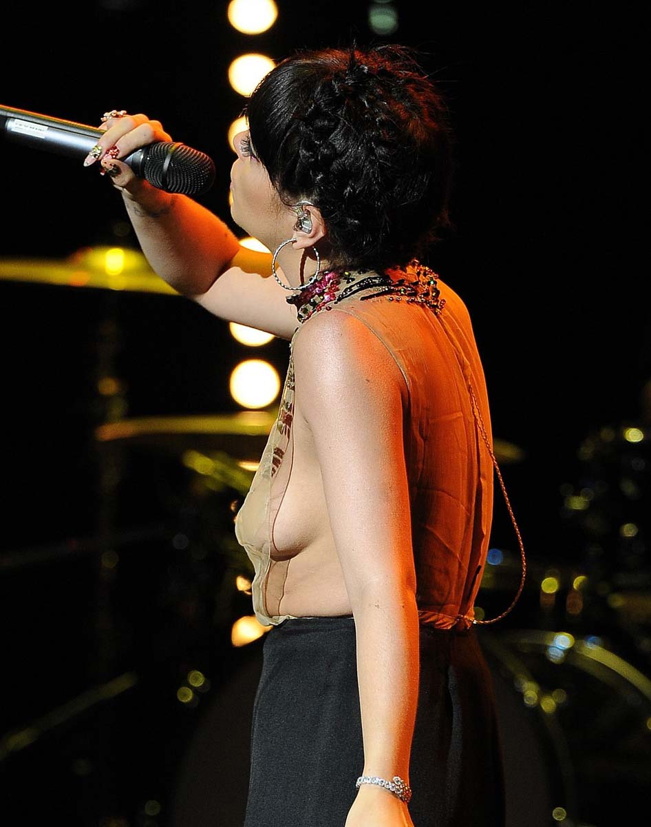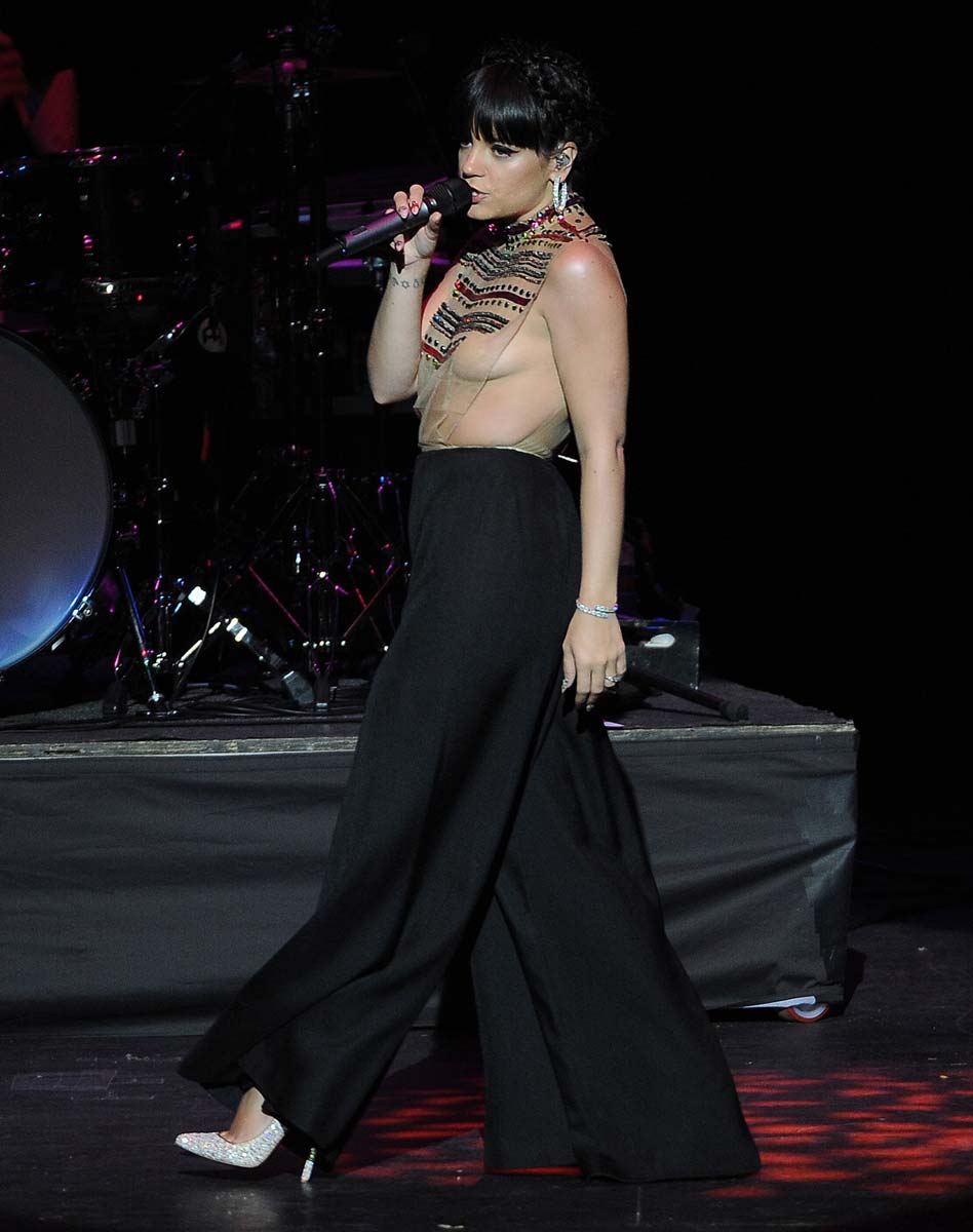 Here is hot Lily Allen sideboob flash in see through top, while performing at a charity event. She definitely gave attendees an eyeful on stage. Lily Allen showed us she is not afraid to show some skin, but she avoided having a Kendall Jenner moment by covering herself up with nude-colored pasties. Lily Allen is a natural kind of gal. Naturally vocally talented, naturally used to working in the entertainment business, and naturally letting her funbags just kind of hang out. So, lets just enjoy the view!