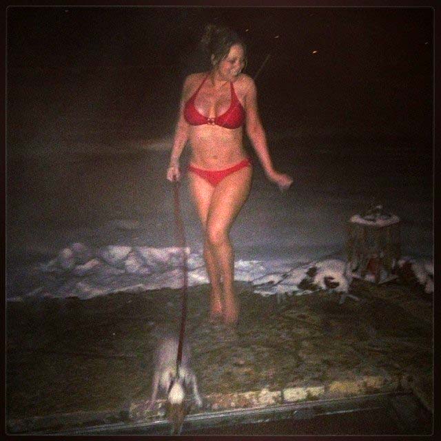 If you ever forget what the definition of “demure” is, come back here to see the true definition in visual form. Just like she does every holiday season, Mimi jumped on a rainbow and slid all the way over to Aspen, CO to put all the hos in ho, ho, ho and bless the eyes of the people with dollops of pure class and refinement. Mariah Carey Instagrammed two pictures of her celebrating the Christmas season by running around with her unicorn tits out. Mimi isn’t going to let a little thing called “hypothermia of the clit” get in the way of her wearing her favorite Xmas ‘kini while posing in the elements. Yes, the temperatures in Aspen have dropped to LOOKATMELOOKATME degrees fahrenheit. Enjoy the view!