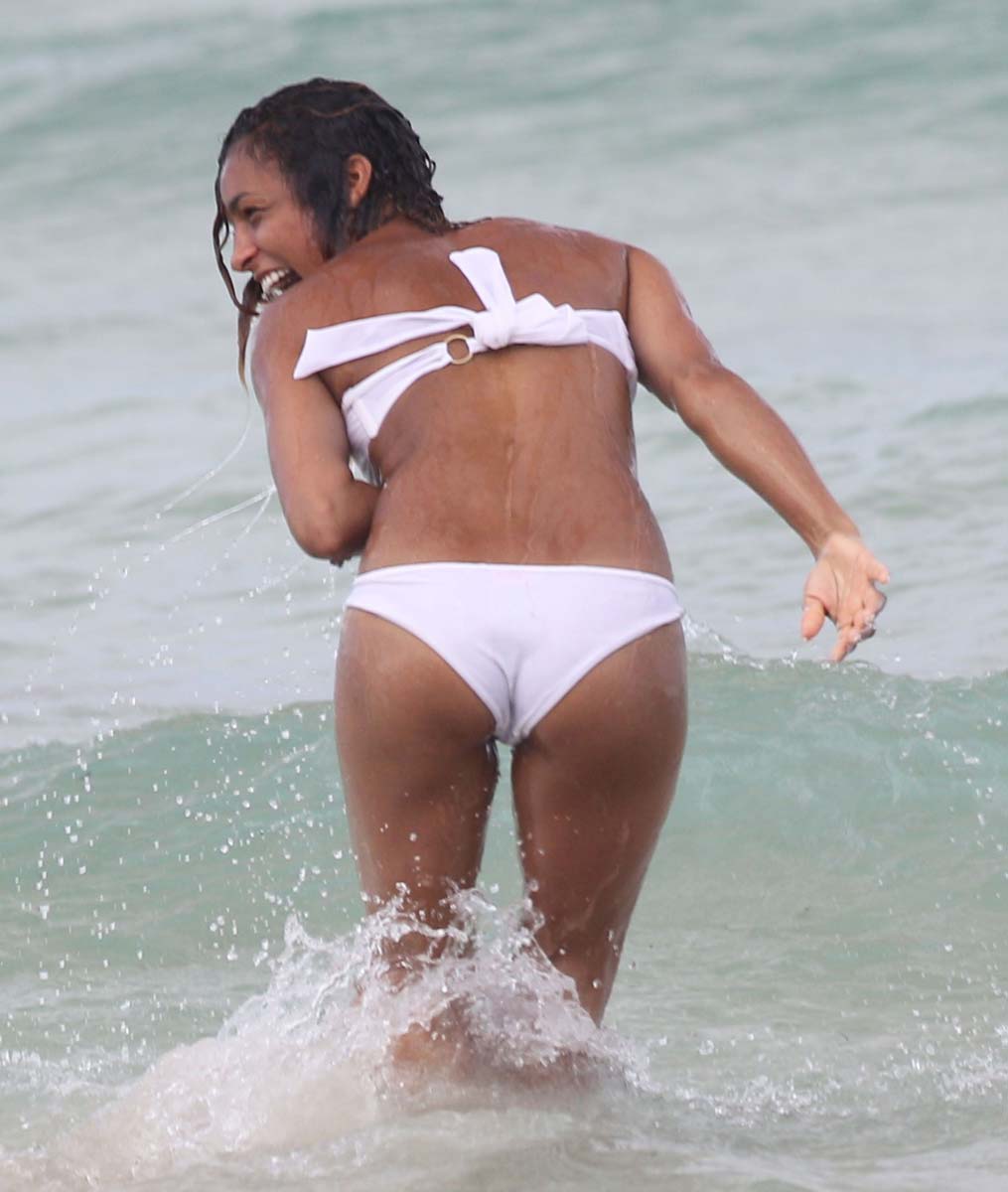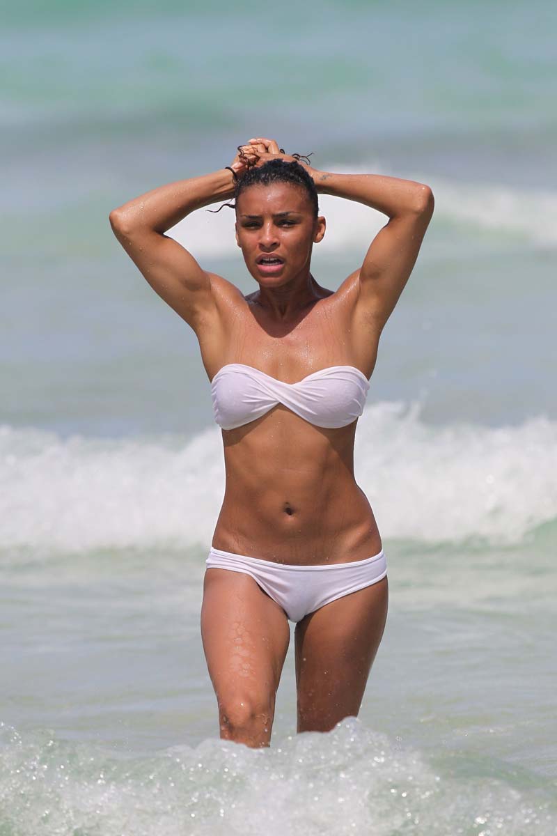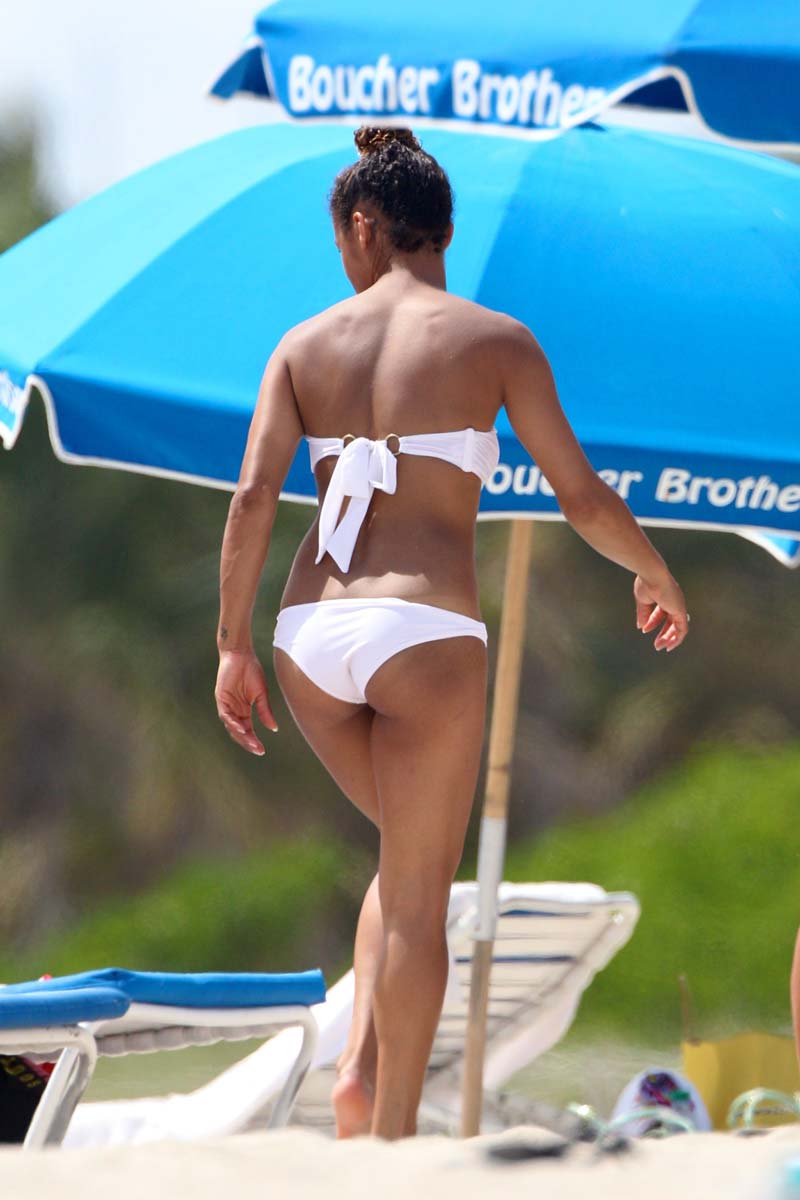Here is another one of the useless members of the Pussycat Dolls, Melody Thornton wearing her white bikini at the beach in Miami. I’m not sure what her role is in the group, but I think she may occasionally sings a “Whoa” here and there and unfortunately I can’t say anything special about those pictures as I could if they were of Nicole Scherzinger. But they are not, so we’ll just have to settle for her. Good thing Melody has a pretty solid body for a former backup dancer. Enjoy.