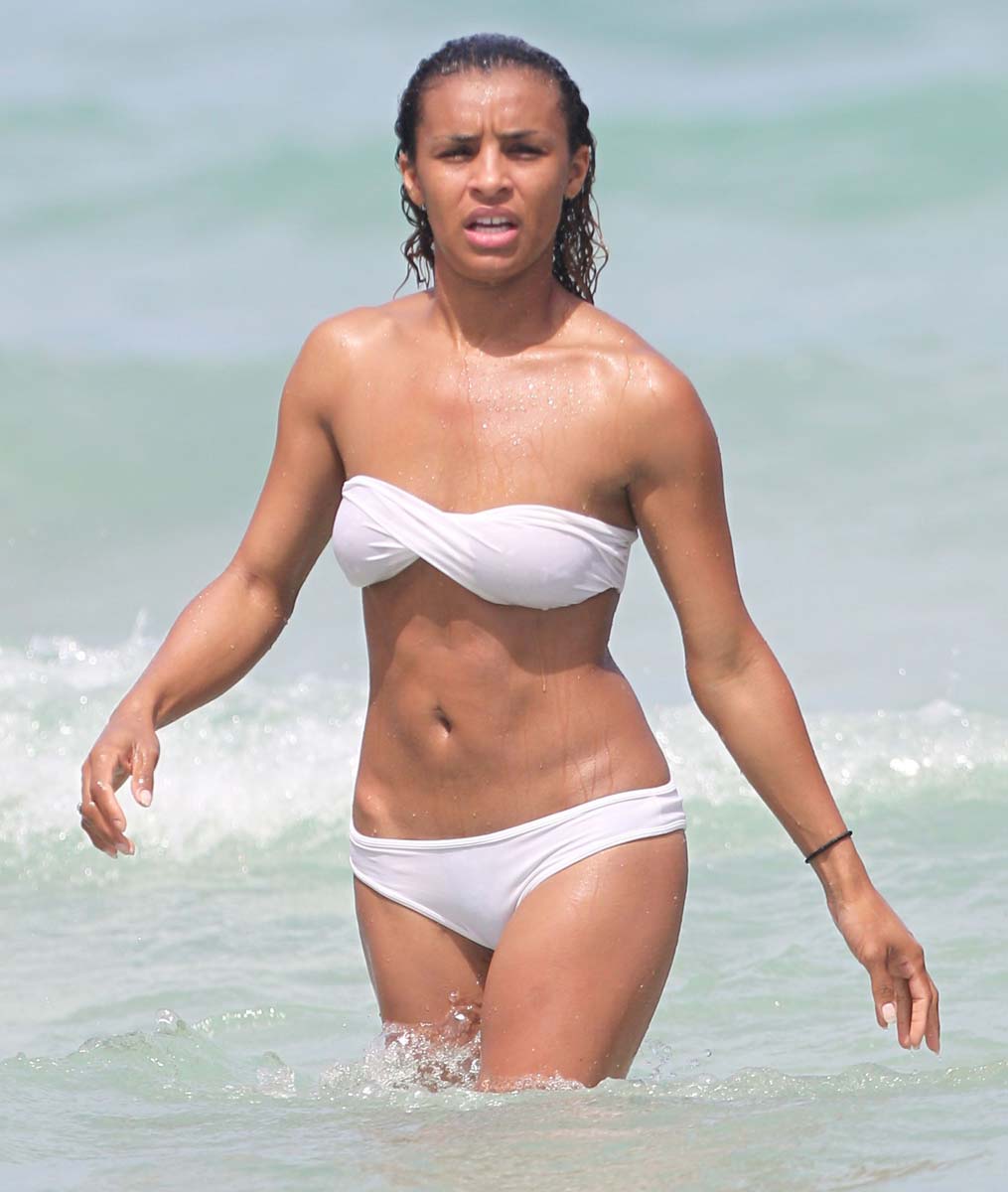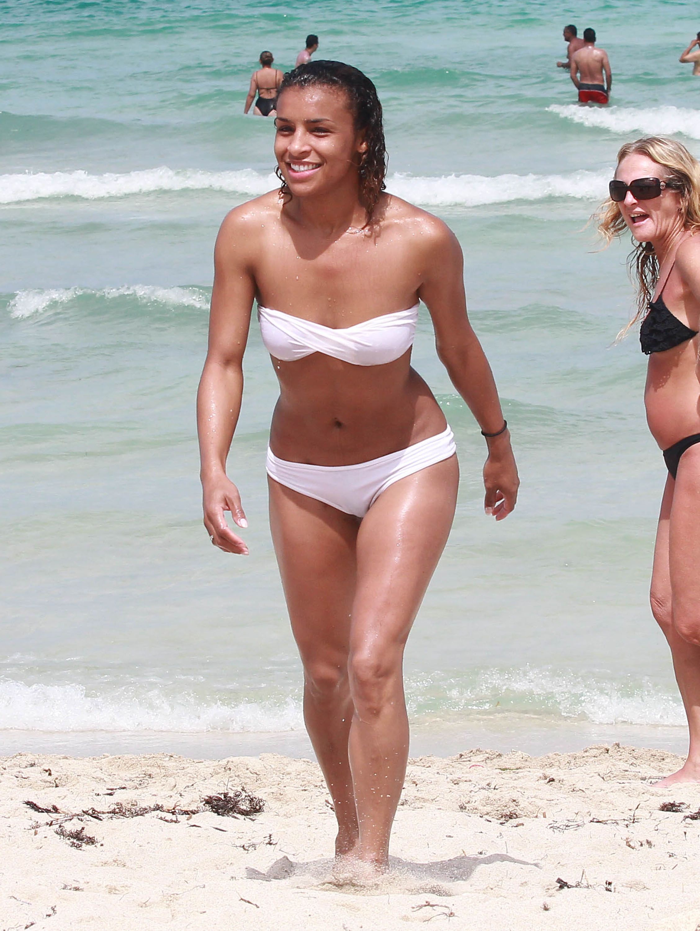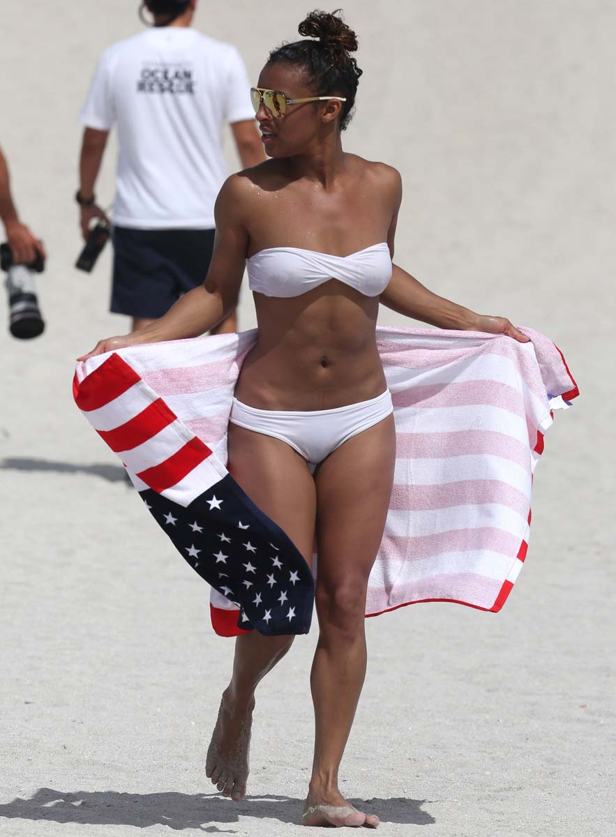 Here is another one of the useless members of the Pussycat Dolls, Melody Thornton wearing her white bikini at the beach in Miami. I’m not sure what her role is in the group, but I think she may occasionally sings a “Whoa” here and there and unfortunately I can’t say anything special about those pictures as I could if they were of Nicole Scherzinger. But they are not, so we’ll just have to settle for her. Good thing Melody has a pretty solid body for a former backup dancer. Enjoy.