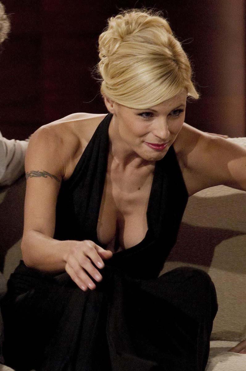 Michelle Hunziker decided to get my attention once again one way or another. Do I have to say that I like the way she chose? Here she is at some German TV show flashing off a hefty amount of those funbags of hers we lust so much in any language and saw so much of barely in her many bikinis this past summer. There’s something I really like about looking down a woman’s top, it reminds me of my teenage days on the second floor of the mall’s food court. Good times. German TV looks like fun…