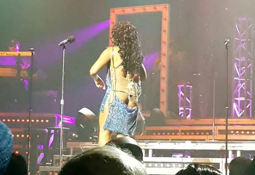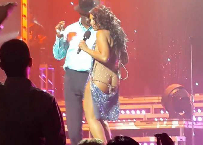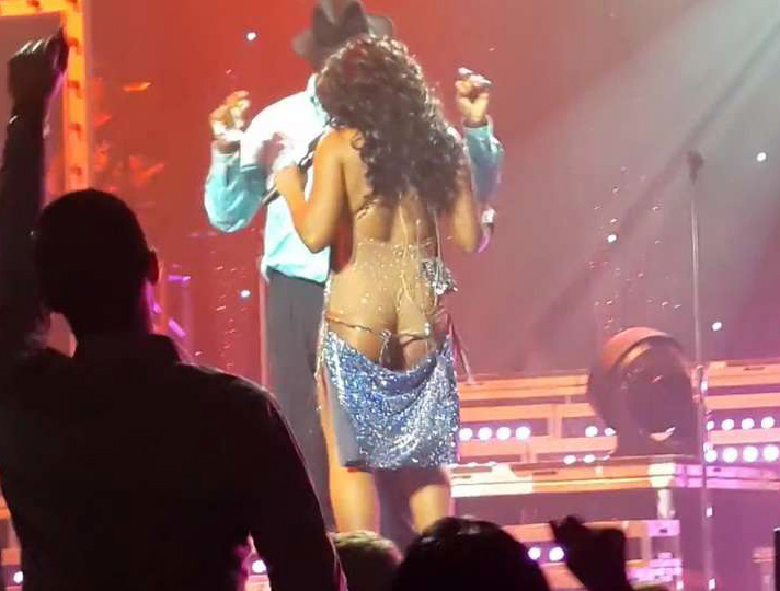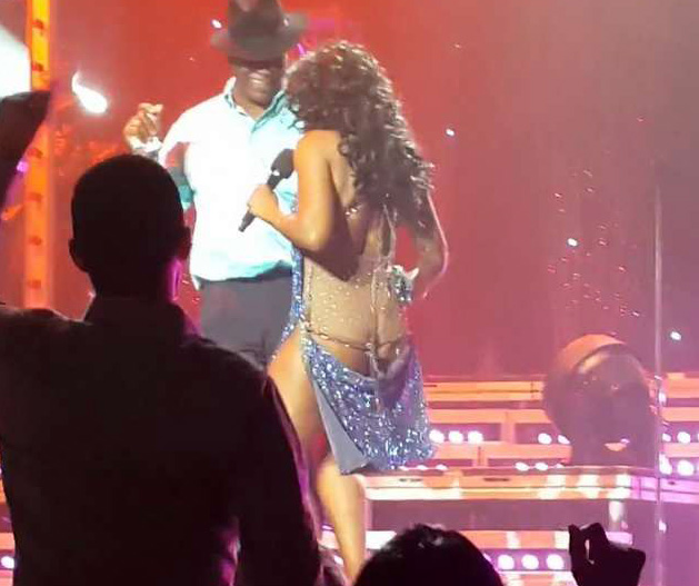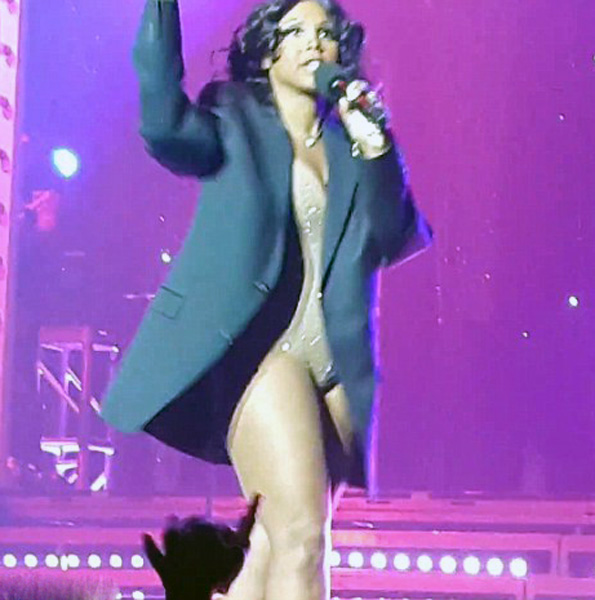 I know most of you don’t care about Toni Braxton but when you see flashing her big ass when her dress fell off you get a new-found respect for her. Toni Braxton couldn’t un-break her dress this week after the back half popped off and exposed her derriere during a concert. To bad she was cheating by using a body suit. Enjoy this nice Toni Braxton wardrobe malfunction!