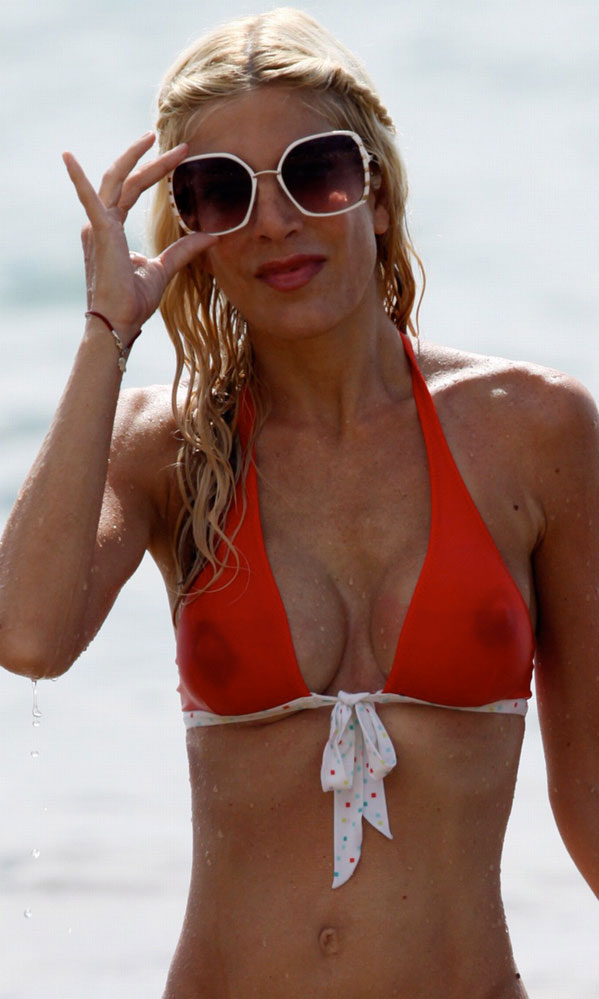 As if the disgusting Tori Spelling bikini pictures I had up the other day weren’t enough for the year, I’ve got even more but this time she decided to mix it up a little by flashing her crosseyed nipples in a see through bikini top. I’m sorry, I had no idea it would come to this.